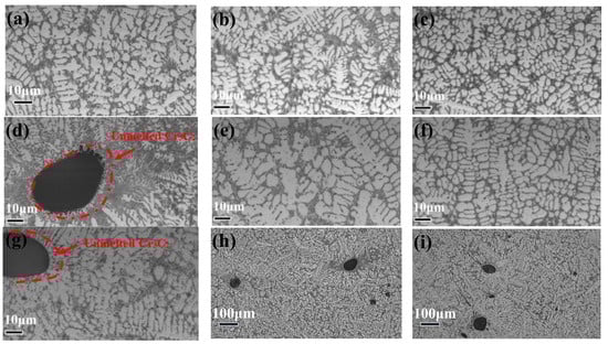 SEM morphology of the cladding layers prepared with different processes: (a) the optimal forming process; (b) a scanning speed of 0.003 m/s; (c) a scanning speed of 0.004 m/s; (d,h) a laser power of 1.8 kW; (e) a laser power of 2.6 kW; (f) a powder feed rate of 0.429 kg/h; and (g,i) a powder feed rate of 0.966 kg/h.