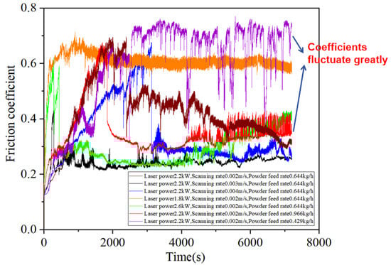 Wear test samples were prepared from the previously determined seven groups of cladding layers. Then, the wear test was conducted and the following friction coefficient curve was obtained.