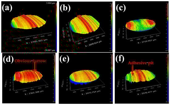 A 3D white light interferometer was used to carry out the observation of the worn pins and discs, and the results are shown in Figure 5. From Figure 5, it can be observed that there were obvious furrows on the surface of the cladding layer with six different processes after wear, thus indicating significant abrasive wear. The furrow was the deepest in the group with a laser power of 1.8 kW. In addition to the obvious abrasive wear observed in the process with a powder feed rate of 0.429 kg/h, there were irregular depressions with obvious material loss on the surface of the grinding pin, thereby indicating that this cladding layer also suffered from serious adhesive wear.