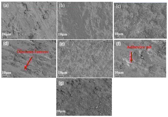 Through SEM observations of the worn surfaces, as shown in Figure 6, it was found that the group with a laser power of 1.8 kw showed obvious furrows on the surface after wear. Meanwhile, the group with a powder feed rate of 0.429 kg/h showed adhesive pits on the surface after wear. These results were consistent with the white light interference results.