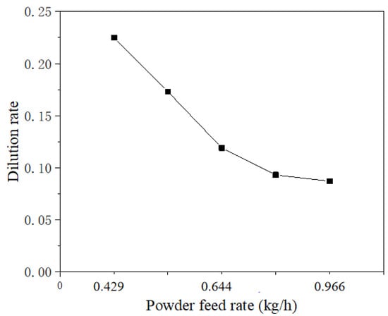 From a visual analysis, it can be seen that the most important factor affecting the dilution rate of the cladding layer was the powder feed rate, and the range values of the other two factors were relatively small, thus indicating a lower degree of influence on the dilution rate. An effect curve was used to more intuitively analyze the influence of the powder feed rate on the dilution rate of a cladding layer.