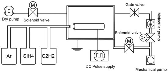 Multilayer Si-DLC films with 10, 20, and 40 cycles were prepared with N80 pipes with a diameter of 75 mm by the HC-PECVD technique. The diagram of the hollow cathode coating system is shown in Figure 1. The heat treatment state of the N80 pipes was normalized (N). The chemical composition of the N80 pipes was mainly composed of elements such as C, Si, Mn, P, S, etc. The metallographic structure of the N80 pipes was pearlite P+ferrite F with a grain size of 9.0. Firstly, the N80 steel pipes were mechanically polished via sand-blasting and a grinding wheel. Secondly, an ultrasonic cleaner was used to clean the N80 steel pipes immersed in acetone and anhydrous ethanol for 20 min in turn, and then they were dried with nitrogen.