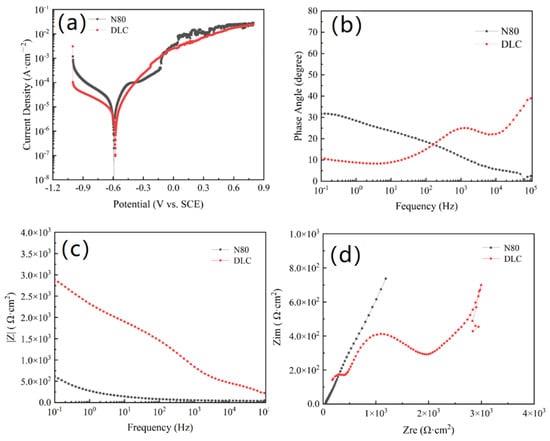 Potentiodynamic polarization curves (a), Bode diagrams (b,c), and Nyquist diagram (d) of the inner surface of N80 steel pipe and Si-DLC film.