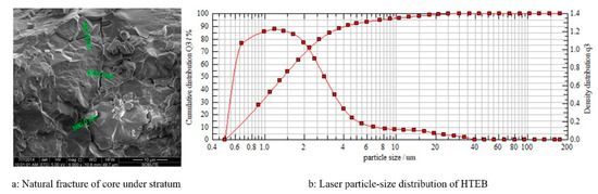 As shown in Figure 2a, some natural fractures appear randomly in the core, the size of which in the early stage is between nanometer and micrometer. To ensure that these cracks can be effectively filled further, the particle size distribution of HTEB is shown in Figure 2b. The modulus particle size and average particle size of HTEB are 1.05 µm and 1.18 µm, respectively, meaning that they are in line with the sizes of the natural cracks, and that they could be used to seal the natural microcracks.