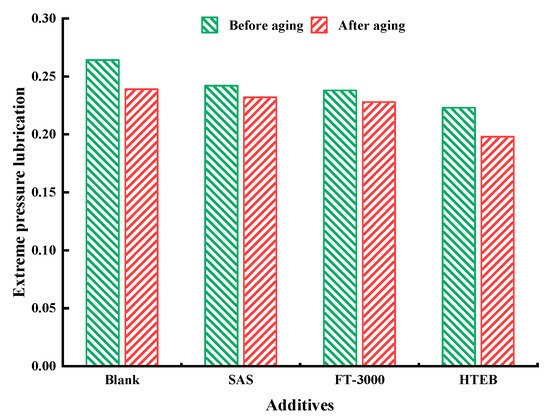 As shown in Figure 3, the extreme pressure lubrication coefficient of the control group after aging shows a similar downward trend; this is because the drilling fluid acts as a lubricant in the drilling process, and the polysulfur drilling fluid substrate forms an oil film on the surface of the drill bit while aging at a high temperature, which can effectively reduce the friction between the drill bit and the rock. Further, with the addition of different additives, HTEB shows the lowest extreme pressure lubrication coefficient no matter whether this occurs before or after aging. This is because powdered SAS and FT-3000 additives do not make it easy for particles to adhere to the drill bit during the lamination process, and HTEB, as an epoxy-modified emulsified asphalt, its asphalt substrate, is lubricating at the same time. The cohesion formed by epoxy curing can make it easier for the drilling fluid to adhere to the oil film on the surface of the drill bit to protect the drill bit, which further shows that the developed HTEB displays stable and excellent lubrication performance regardless of low or high temperatures.