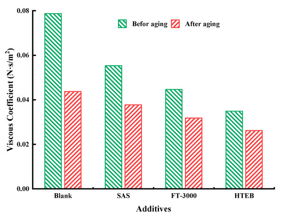 As shown in Figure 4, like the change in the law of the extreme pressure lubrication coefficient, the viscous coefficient also shows a downward trend with aging. The reason why drilling fluid without additives decreases significantly is because of the formation of oil film. It can protect the drill pipe to a greater extent and reduce the friction between the borehole wall and the drill pipe. Further, with the addition of additives, HTEB shows the lowest viscous coefficient before and after aging, which is because, on the one hand, the powdered SAS and FT-3000 additives do not make it easy for particles to adhere to the drill pipe during the film lamination process; on the other hand, the epoxy-modified asphalt in HTEB has good bonding properties, which can form a mud cake on the wall. This thin and dense mud cake can greatly reduce the friction between the wall and the drill pipe. At the same time, the emulsified asphalt in HTEB has a lubricating effect, which can reduce the addition of lubricant components in the overall drilling fluid to a certain extent, and effectively reduce costs. This further demonstrates that the developed HTEB has good lubricating properties and excellent economic benefits.