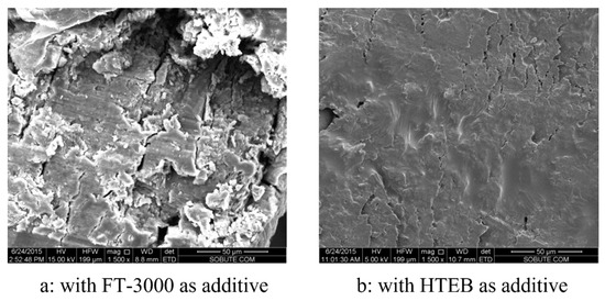 As shown in Figure 5a, the mud cake which formed after the addition of FT-3000 is very thick and has many microcracks inside, which makes it easy for water to penetrate through the microcracks, leading to the further loosening of the mud cake. On the contrary, it can be found that the mud cake formed after the addition of HTEB is thin and has few microcracks, and the dense mud cake structure makes it difficult for water to penetrate it. Compared with FT-3000, HTEB is an epoxy-modified emulsified bitumen, and the three-dimensional network structure of the epoxy can be better combined with the asphalt molecular chain during the reaction process so that its intermolecular force is enhanced and has stronger cohesion and adhesion. Therefore, the HTEB microcrack repair agent proposed herein for sealing microcracks shows superior performance compared to the market-proven materials (FT-3000).