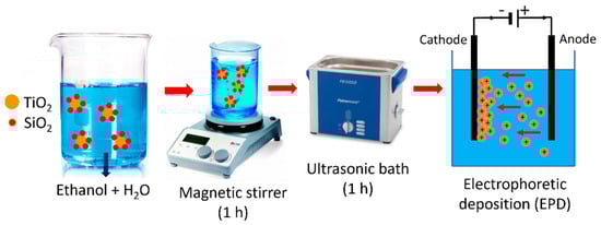 The deposition of coatings employed the electrophoresis technique, utilizing a colloidal suspension with a concentration of 0.1 wt.% of nano-composite SiO2–TiO2 powder in 75% ethanol (Avantor Performance Materials, Gliwice, Poland). Before deposition, the suspensions were stirred into a magnetic stirrer for 1 h and treated in an ultrasonic bath for 1 h.