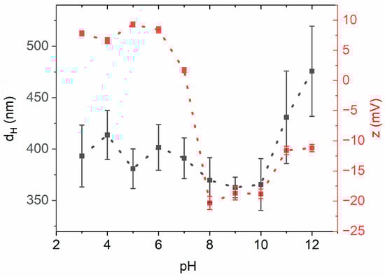 The Zeta potential and particle size were determined as a function of pH for the colloidal suspension, and the results are illustrated in Figure 2. Zeta potential is a crucial indicator of suspension stability and particle mobility and gives information about the degree of particle dispersion within the suspension. Typically, the highest positive values (or the lowest negative values, contingent on cataphoresis or anaphoresis) signify improved dispersion [20]. The colloidal suspension of the TiO2–SiO2 nano-composite revealed a positive Zeta potential value in the pH range from 3 to 7, transitioning to a negative value for higher pH. A notable decrease in value occurred between pH 7 and 8, indicating the likely location of the isoelectric point. Furthermore, Zeta potential values increased for pH 11 and 12, correlating with the observed enlargement of particle diameter or their aggregates in these environments.
