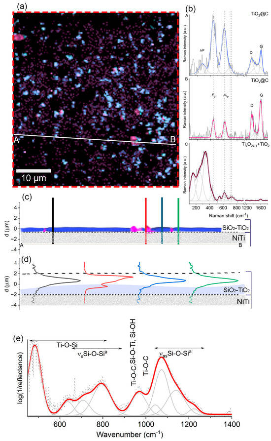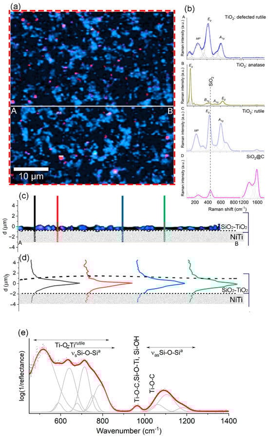 A chemical and structural differentiation image of the SiO2–TiO2 coating is presented in the X- and Y-directions (a) and X- and Z-directions (c). The averaged Raman spectra (A–D) corresponding to individual color-highlighted spots (light and dark blue: rutile and defected rutile, pink: carbon-silica, yellow: anatase) observed on the Raman maps are depicted in the image (b). Depth scan profiles of four exemplary locations on the X- and Y-direction cross line A,B are illustrated in (d), with dashed lines on the depth profiles indicating the boundary of the SiO2–TiO2 coating. (e) FTIR average spectrum gathered of the red dash-line square.