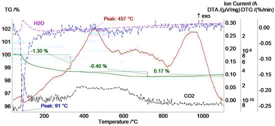Comprehending the thermal stability of coat-forming materials is also crucial in establishing the suitable heat treatment temperature. Consequently, the thermo-gravimetric method was employed to assess the thermal stability of the TiO2–SiO2 nanopowder under varying temperature conditions (Figure 6). The results indicated that up to a temperature of 725 °C, the nano-composite sample underwent a 1.70% reduction in its initial mass in two distinct stages: 1.30% loss up to 340 °C and an additional 0.40% loss up to 725 °C. The initial 1.30% mass loss is attributed to the release of water (with the maximum release occurring at 94 °C) and carbon dioxide (with the peak release at 92 °C). In the second stage, from 300 °C to 700 °C, a continuous release of CO2 was observed, with a maximum at 391 °C and 581 °C. The differential thermal analysis (DTA) curve exhibits an exothermic thermal effect, peaking at 457 °C, suggesting a potential combustion reaction. It should be considered that trace amounts of carbon in the TiO2–SiO2 nano-composite, originating from the synthesis process, could influence the progression of the reaction within the heat-treated coating and impact the types of formed new phases.