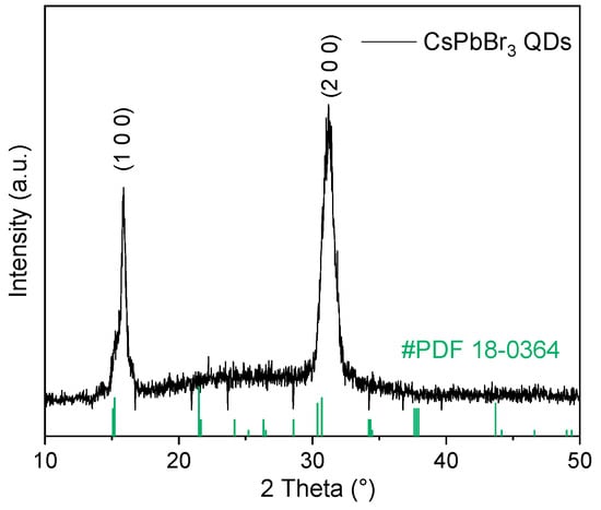 In order to confirm that the cubic grain belongs to the CsPbBr3 phase, XRD characterization was performed and is presented in Figure 2. The diffraction peaks at 15.9° and 31.3° are attributed to the (100) and (200) crystal planes of cubic CsPbBr3 perovskite (PDF 18-0364), respectively, and no other impurity peaks appear. This proves that pure CsPbBr3 QDs with good crystallinity have been successfully synthesized.