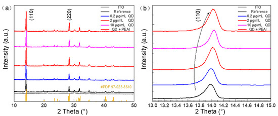 The largest grain size for the CsPbBr3 QD-modified perovskite layer is further supported by XRD patterns from Figure 4. The (110) peak intensity of PFs modified with CsPbBr3 QDs was enhanced compared to the undoped sample. The PFs with 2 μg/mL CsPbBr3 QDs showed the strongest peak intensity and the corresponding narrowest FWHM of 0.178°, as shown in Table S1. From Figure 4b and Table S1, it can also be found that the position of the (110) peak gradually moves towards the large angle from 13.97° for the reference to 14.04° of the PFs modified with 10 μg/mL CsPbBr3 QDs. This is because the smaller radius of Cs+ and Br− ions in CsPbBr3 QDs enter the MAPbI3 lattice to replace the larger MA+ and I− to form CsxMA1-xPbI3-yBry, resulting in a contraction of the perovskite lattice [], which can be further proved by EDS mappings of CsPbBr3 QDs and PEAI dual-modification PFs in Figure S2. Br elements, like Pb and I, are evenly distributed in the grains of perovskite after further surface modification by PEAI (Figure S1c), although the grain size, (110) diffraction peak intensity, position, and FWHM remain almost unchanged (Table S1). This demonstrates that the modified PEAI molecules can uniformly cover the grain boundary and interface of the perovskite layer, slightly adjust the surface morphology of the film, and thereby reduce its roughness [,]. In addition, PEAI also has the function of filling the ion vacancies and passivating defects on the surface of PFs, which will be discussed in detail later. High-quality PFs with better crystallinity, large grain size, and a dense and smooth surface will help to improve the photovoltaic performance of PSCs [,].