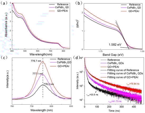 (a) Absorption spectra, (b) Tauc plots, (c) steady-state emission spectra, and (d) TRPL spectra of the reference sample, CsPbBr3 QD-doped sample, and CsPbBr3 QDs and PEAI jointly modified PFs on SiO2 substrate.