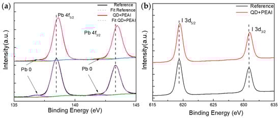 XPS spectra of reference sample and perovskite films jointly modified with CsPbBr3 QDs + PEAI: (a) Pb 4f and (b) I 3d.