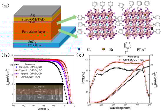 To directly demonstrate the superior performances of jointly modified PSCs, five kinds of PSCs were fabricated according to the structure shown in Figure 7a, and their photovoltaic characteristics were analyzed. The detailed photovoltaic parameters are listed in Table 1. Figure 7b,c show the J-V scan curves and monochromatic incident photon-to-electron conversion efficiency (IPCE) data of PSCs that were unmodified, modified only by CsPbBr3 QDs, and jointly modified by CsPbBr3 QDs and PEAI. PSCs only modified with CsPbBr3 QDs acquired a PCE of 20.08% with a Voc of 1.13 V, Jsc of 23.20 mA/cm2, and FF of 76.6% when the optimized CsPbBr3 QDs concentration of 2 μg/mL was doped, which is markedly higher than the 17.21% of the reference device. The enhanced photovoltaic properties benefit from the obtained stable CsxMA1-xPbI3-yBry perovskite film with the large grains and low bulk defects which improve light absorption and suppress carrier recombination inside perovskite crystals. PSCs with dual modification of CsPbBr3 QDs and PEAI can further improve PCE and show the best value of 21.04% with Voc increased to 1.15 V, Jsc to 23.30 mA/cm2, and FF up to 78.6%. This is because PEAI molecules uniformly cover the grain boundary and interface of the perovskite layer, further fill the ion vacancies, slightly adjust the surface morphology of the film, and effectively block the direct contact between HTL and ETL at the perovskite grain boundary. Correspondingly, the integrated current value of the jointly modified PSC also increases from 19.4 mA/cm2 of the reference cell to 22.6 mA/cm2, which matches with the current density results obtained from the J-V scanning curve.