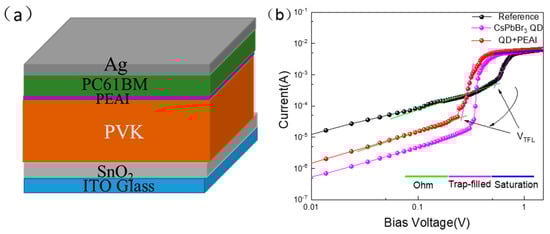The defect density of PFs can be calculated by the space charge limit current (SCLC) curves of electron-only devices modified by different methods. As shown in Figure 8a, the structure of electron-only devices is an ITO/SnO2/perovskite layer with different modified methods/PC61BM/Ag. The corresponding SCLC curves are exhibited in Figure 8b. The voltage cross-points of extension lines from the Tangent of Ohm area and trap-filled area are defined as the trap-filling limit voltage (VTFL). The VTFL values of the reference, modified only by CsPbBr3 QDs, and jointly modified by CsPbBr3 QDs and PEAI perovskite devices are 0.564 V, 0.341 V, and 0.221 V, respectively. The reduced VTFL means that defects of the perovskite layer have greatly been suppressed after modification, which can be further proven by the calculated defect density according to the following Equation (3):