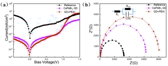 The dark J-V curves and electrochemical impedance spectroscopy (EIS) of three kinds of PSCs were also measured and are given in Figure 9. It is evident that the dark current density of the CsPbBr3 QD-modified PSCs has decreased by nearly two orders of magnitude compared to the reference device, while the PSCs jointly modified with QDs and PEAI have the lowest dark current density. The corresponding recombination resistance is 3986 Ω, which is larger than the values of 2987 and 1156 Ω for the QD-modified and reference PSCs, respectively. These results further support that the joint modification of QDs and PEAI can reduce carrier recombination at the interface and improve PCEs.