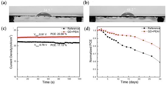 Figure 10a,b present the hydrophilic contact angle test for the unmodified and jointly modified PFs. The contact angles are 34.5° and 48.2°, respectively, indicating that the spin-coated PEAI molecular layer enhances the hydrophobicity of PFs, which can better suppress the erosion of water vapor on perovskite films and improve the ambient stability of the final devices. Furthermore, the steady-state maximum power output curves of two kinds of unpacked PSCs were recorded at different bias voltages for 120 s under the ambient conditions of 20 °C and relative humidity of 40% in Figure 10c. The QD and PEAI jointly modified PSCs show not only a higher power output of 20.56% but also a better stability of current output. After aging for 30 days, the normalized PECs of the jointly modified cell still maintain 75% of the original PCE, while the reference PSCs only retain 59% of the initial value (Figure 10d). Furthermore, the VOC, FF, and JSC of the jointly modified PSCs also show the relatively gentle changes compared to the reference cell (Figure S5). The better crystallinity and hydrophobicity properties, the more compact and smoother surface, and the reduced defect density of the perovskite layer can contribute to better light and ambient stability for the QD and PEAI jointly modified PSCs [].