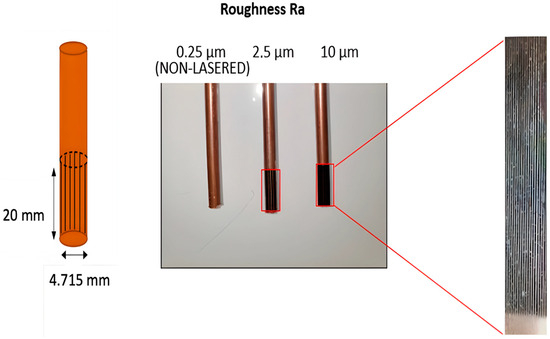 The surface treatment enabled an increase in the roughness of the copper substrate before the coating process was microprocessed by the technological center for optics and lasers, Alphanov (Bordeaux, France). An ultrafast fiber laser system (Tangerine HP, Amplitude Systems) emitting in the near infrared (central wavelength λ = 1030 nm) with an average power of 42 W and delivering ultrashort pulses whose width was between 0.35 ps and 10 ps was utilized for the texturing experiments. The average energy per pulse was indicated at 225 µJ and the maximum repetition rate was 40 MHz. The microprocessing was carried out longitudinally (Figure 1). A TR200 surface roughness tester was used to measure the average arithmetic roughness, Ra (µm). It is equipped with a standard sensor, TS-100 (Checkline Europe, The Netherlands), with a 5 μm diamond tip with 0.001 μm accuracy. The measurement interval ranges from 0.001 μm to 40 μm. According to ISO 4287 [22], Ra is the average of how far each point on the surface deviates in height from the mean height: