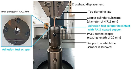 To assess the adhesion of PA11 coating on copper cylinders, peel tests were conducted. These tests involved removing the coating from copper substrates. For this purpose, an MTS tensile test device was employed with a 1 kN load cell, operating at 6 mm·min−1. We used a custom-made scraper to determine the adhesion strength at the interface between the coating and the copper substrate along the copper cylinder (Figure 3). More details on the mechanical test are given in our previous paper [20]. We performed tests on five replicate specimens of each material to ensure reliability.