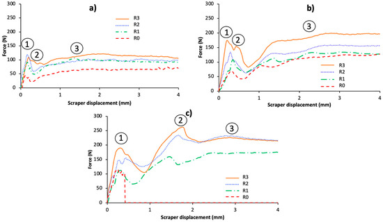 Force versus scraper displacement curves of nonsterilized PA11 coatings whose copper substrates were preheated to 270 °C (a), 300 °C (b) and 320 °C (c) (zone1: first maximal force required to remove the small upper part of the coating; zone 2: second maximal force corresponding to the binding of this upper coating part; zone 3: constant force corresponding to the progressive unfolding of the lower part of the coating).