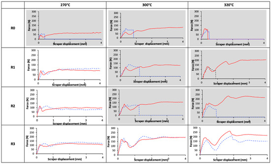 However, a sharp difference was clearly identified between nontextured and textured copper substrates subjected to the highest preheating temperature (320 °C) (Figure 4). Indeed, we can observe that the force fell to 0 after 0.4 mm of scraper displacement before engraving. This means that the complete coating was removed from the nontextured copper substrates witnessing a very poor anchoring. This fact was developed in our previous paper and was explained with the copper oxide layer that formed on the surface limiting the interfacial adhesion [20]. Nevertheless, textured samples present greater results since the engraving allows for the maintenance of the coating on the substrate surface despite the severe preheating conditions (T = 320 °C). Thus, the roughness parameter strongly influenced the adhesion for the highest preheating temperature and favored the adhesion of the thermoplastic on the metal part during the coating process. This can be easily explained by the higher surface area of the copper support that is in contact with the polyamide coating allowing a higher quantity of thermoplastic to melt onto the metal surface during processing.