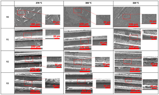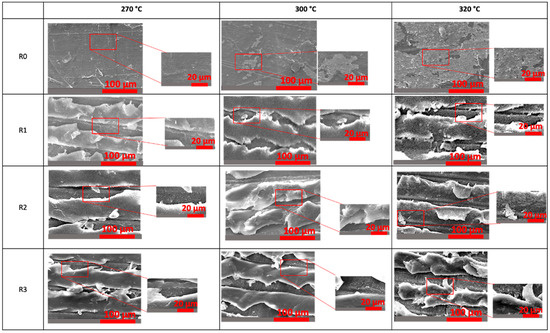 Also, to assess the impact of the copper texturing on the quantitative data, the adhesion strengths of the samples were recorded in Table 2. It can be observed that, whatever the preheating temperature, the strength notably increased after texturing. However, we notice only an unsubstantial increase of the adhesion strength with the increase of the Ra parameter (from R1 to R3) induced with the femtosecond laser. This means that the increasing depth of valleys produced with the laser on the substrate did not favor the anchoring of the thermoplastic on the metal. Thus, we suppose that the regularity of the metal surface induced with the engraving procedure mainly favored the adhesion performance rather than the depth of the regular linear troughs. SEM analyses presented later will allow for the verification of our hypotheses and will deepen the discussion.
