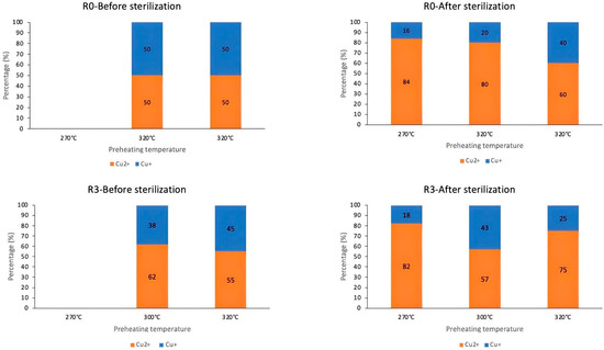 Figure 8 depicts the contribution of copper-based species present on the analyzed coating samples that were deduced from the XPS spectra. Before sterilization, copper-based species were found under two forms, copper (I) oxide Cu2O and copper (II) hydroxide Cu(OH)2, that were clearly identified for all untextured and textured samples (R0 and R3) except from nonsterilized samples whose copper was preheated to 270 °C (at the left of Figure 8). The presence of these species is due to the severe preheating conditions carried out at 300 °C and 320 °C having oxidized the metal. Then, after sterilization, Cu2O and Cu(OH)2 are present at the coating surface regardless of the preheating temperature (even at 270 °C). This suggests that the sterilization caused the oxidation of the metal surface. In addition, we noticed that the rate of Cu(OH)2 particularly increased after sterilization. As proposed in our previous study, the formation of copper (II) hydroxide can result from copper (I) oxide in the presence of water and oxygen [20]. Hence, the steam formed during sterilization has certainly contributed to the formation of copper hydroxide. However, the presence of this copper oxide after sterilization did not affect the interfacial adhesion between the coating and the metal substrate presenting the highest Ra value (R3). Indeed, as seen previously, the 10 µm engraving (R3) of the copper substrate generated mechanical performance (adhesion strength) comparable to those of nonsterilized ones.
