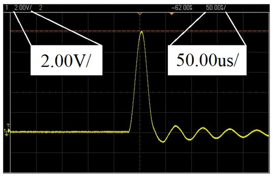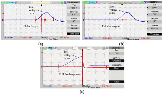 Figure 12a,b shows the oscillograms of voltages at the formation of test voltage pulses and the occurrence of partial discharges: pulse ui(t) of the test voltage (in blue) and pulses of voltage drop on the shunt uR(t), included in series in the measurement circuit, are caused by the flow of partial discharge currents (in red). Figure 12c, shows the oscillograms of ui(t) and uR(t) pulses at full discharge through the interelectrode gap in the area of the through coating defect.