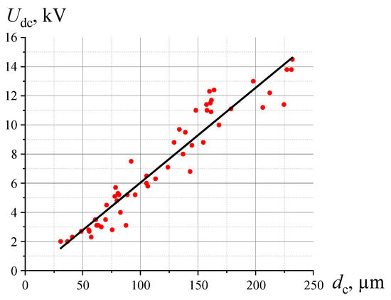 The larger scatter in the values Udc of polystyrene can be explained by its low density and, as a consequence, the large influence of the probabilistic processes of streamer formation in the material. The calculation of using Equation (5) is applicable to both single-component and multilayer coatings, with their parameters available in the reference literature, such as those for anti-corrosion coatings on pipelines. However, it should be considered that the parameters required for the calculation of multi-component coatings (e.g., paint and varnish coatings) are usually not standardized. Therefore, multi-component coatings or coatings for which it is not possible to determine by calculation should be determined empirically. To experimentally determine , the recommendation is to employ a coating sample that is either identical to or closely resembles the one being tested in terms of composition and thickness, and apply it to a conductive substrate.