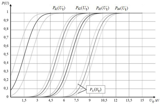 The probability dependence graph of defect detection P(Udc) indicates the dependability of the testing process. The chart, portraying a sigmoid function, delineates the boundaries of the interval at a specified confidence level (illustrated by dashed lines). Obviously, with increasing dc, the characteristic P(Udc) shifts to the right. It is also advisable to construct the relationship P(Udc) to achieve a confidence probability of 0.9 (90%) when conducting tolerance testing for coating defects (detection of areas of inadmissible thinning) [29,30]. Therefore, it is feasible to ascertain the dielectric strength of the coating (Ep) with a defect detection probability set at 90% for every examined coating sample (Figure 8).