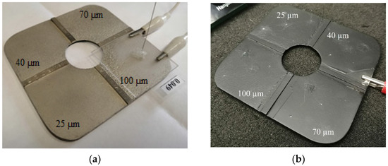 To evaluate the effect of substrate surface roughness (e.g., after sand or shot blasting) on breakdown voltage, experiments were conducted with an Elcometer 125 Surface Comparator on shot roughness samples. In the first case, a 0.05 mm thick film with a hole simulating a defect was mounted on the sample. An electrode was placed on the surface of the film in the area of the hole. The structure was fixed with clamps (Figure 15a). In the second case, the roughness samples were painted with MLS 306 enamel (Figure 15b). In both cases, the spark breakdown occurrence voltage was recorded for different values of surface roughness.