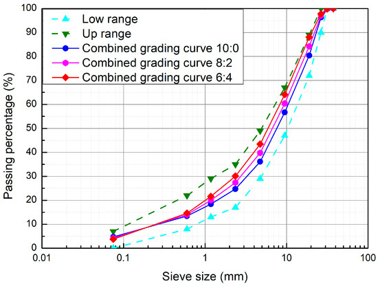 Considering factors such as the thickness ratio between the old asphalt pavement surface layer and base layer, actual construction conditions, and economic considerations, it is common practice to limit the mass proportion of reclaimed asphalt pavement in full-depth recycling mixtures to a maximum of 40%. Consequently, three representative mineral compositions were devised for the experimentation, with base-to-surface ratios of 10:0, 8:2, and 6:4, respectively. As a result of these experiments, three distinct gradation curves were obtained for recycled materials. The synthesized gradation curve is illustrated in Figure 2.