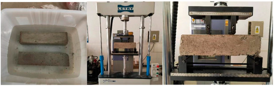 The load levels for the fatigue tests were determined based on the flexural strength. Each test group employed 12 specimens, with dimensions measuring 100 mm × 100 mm × 400 mm and a curing time of 90 days. Adhering to the Chinese specification JTG E51-2009 [33], as per T0851-2009, the specimens were positioned in fixtures, aligning the loading direction with the pressure direction during molding. The loading device and specimen utilized in the bending strength test were consistent with those employed in the fatigue test, as depicted in Figure 4. Rapid loading was applied at a rate of 50 mm/min, and the ultimate load at the point of failure was recorded. The flexural strength was calculated using Equation (2).