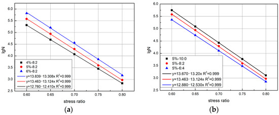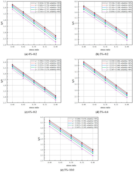 Using the target fatigue life at a 50% reliability level for each mixture as foundational data, a logarithmic transformation of stress levels and fatigue life values was conducted following Equation (12) for linear regression analysis. This process resulted in the fitting of stress–fatigue equations, as shown in Figure 8, and the determination of equation coefficients, as detailed in Table 8.