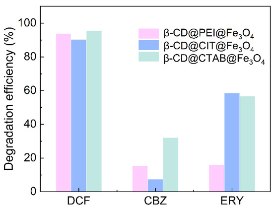Comparative degradation efficiency of β-CD@CIT@Fe3O4, β-CD@PEI@Fe3O4, and β-CD@CTAB@Fe3O4 against DCF, CBZ, and ERY.
