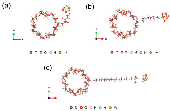 Schematic illustration of (a) β-CD@CIT@Fe3O4, (b) β-CD@PEI@Fe3O4, and (c) β-CD@CTAB@Fe3O4.