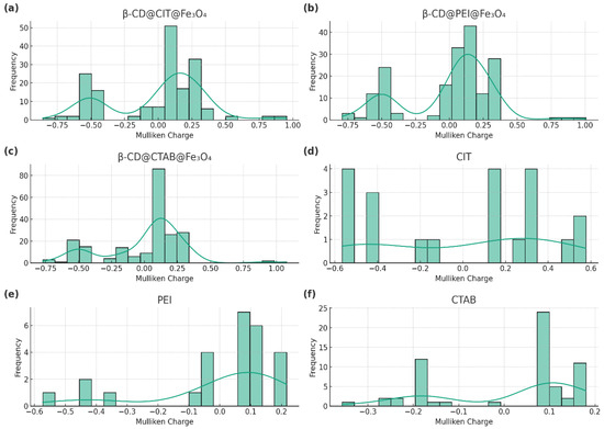 Histograms of Mulliken charges for (a) β-CD@CIT@Fe3O4, (b) β-CD@PEI@Fe3O4, (c) β-CD@CTAB@Fe3O4, (d) CIT, (e) PEI, and (f) CTAB.
