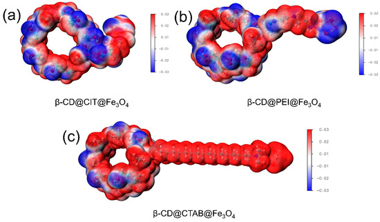 An in-depth investigation of the electrostatic potential distribution characteristics was further conducted to reveal that the electrostatic properties imparted by the linkers significantly modulated the interaction of these nanocomposites with various pollutants. As displayed in Figure 4a, for β-CD@CIT@Fe3O4, the uniform charge distribution, primarily influenced by the CIT linker, suggests a balanced electrostatic environment. This characteristic is favorable for the adsorption of neutral pollutants, where charge neutrality plays a crucial role in interaction [19]. Furthermore, the moderate charge distribution endows this material with the versatility to interact with pollutants under a range of pH conditions, thus enhancing its application potential in diverse environmental settings [20]. In the case of β-CD@PEI@Fe3O4 (Figure 4b), the PEI linker imparts a distinct charge pattern, characterized by regions of high positive charges. This feature is particularly advantageous for the adsorption of negatively charged (anionic) pollutants typically found in alkaline environments. The enhanced electrostatic attraction in these regions could lead to improved capture efficiency for such pollutants [21]. Conversely, β-CD@CTAB@Fe3O4 in Figure 4c, influenced by the CTAB linker, exhibits a charge distribution that is conducive to the adsorption of positively charged (cationic) pollutants, commonly present in acidic environments. The higher negative charge regions within this material could favorably interact with these pollutants, facilitating their effective removal. These insights into the charge-dependent pollutant removal mechanisms underscore the significance of tailored charge engineering in cyclodextrin-based nanocomposites.