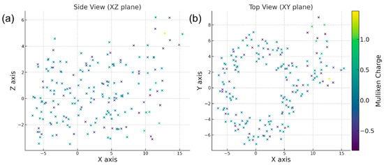Building on the preliminary results discussed in Section 3.2, β-CD@CTAB@Fe3O4 was selected for further investigation due to its unique chemical properties and demonstrated effectiveness in contaminant adsorption and degradation, laying a solid foundation for a deeper exploration of its mechanisms and potential applications. In this study, we also meticulously investigated the adsorption configuration and charge density distribution of PMS on β-CD@CTAB@Fe3O4 nanoparticles, using advanced computational simulation techniques. Through molecular dynamics simulations, we acquired the three-dimensional coordinates and Mulliken charges of PMS molecules on the surface of the composite material. The results demonstrate a specific spatial arrangement of PMS molecules on the material’s surface, indicating strong interactions and potential orientation dependence with the substrate [22]. Observations from the side view (XZ plane) in Figure 5a and top view (XY plane) in Figure 5b reveal an uneven distribution of charge density between the PMS molecules and the surface of the β-CD@CTAB@Fe3O4 composite material. Particularly, significant variations in Mulliken charge values can be noted in certain areas, highlighting the uneven distribution of charges among the molecules, probably resulting from specific adsorption sites and interactions of PMS molecules on the material’s surface.