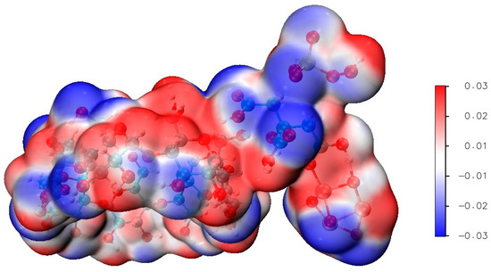 Following the molecular dynamics insights, DFT calculations were employed to elucidate the adsorption-induced electrostatic potential landscape of PMS on β-CD@CTAB@Fe3O4 nanoparticles. The electrostatic potential map, as visualized in Figure 6, reveals a pronounced heterogeneity in charge distribution across the interface of the adsorbed PMS and the composite material. Regions of elevated positive potential (represented in red) interspersed with zones of negative potential (depicted in blue) are indicative of distinct areas of electron density accumulation and depletion, respectively. This dichotomy in charge polarization is indicative of the nuanced electrostatic environment created by the adsorption of PMS, which is a critical factor influencing the reactivity and stability of the adsorbed species [23]. The DFT-derived electrostatic potential map provides a quantum-level understanding of the adsorptive interactions, offering insights into the localized electronic environment that could govern the catalytic degradation pathways of PMS on the β-CD@CTAB@Fe3O4 surface. The intricate pattern of the potential distribution is a testament to the complex interplay between the PMS molecules and the functionalized magnetic nanoparticles, potentially leading to unique sites of enhanced catalytic activity due to the spatially varied electronic characteristics.