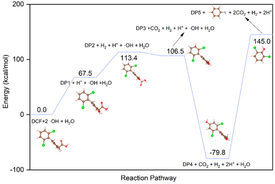 In this comprehensive computational study, DFT calculations elucidated the intricate energy landscape underlying the oxidative degradation of DCF via the β-CD@CTAB@Fe3O4/PMS system predominantly involving hydroxyl groups (·OH). The calculated potential energy profile reveals a sequential reaction pathway punctuated by a series of intermediates, each delineating the stepwise transformation of DCF in the presence of potent hydroxyl radicals generated from PMS activation (Figure 8). Initiation of the reaction pathway is characterized by the formation of the first intermediate (DP1), where the energy requirement (67.5 kcal/mol) suggests the surmounting of a significant activation barrier, probably involving the addition of ·OH to the DCF molecule or the abstraction of a hydrogen atom. This step is crucial as it primes the DCF molecule for subsequent degradation steps, which is consistent with the known reactivity of hydroxyl radicals towards aromatic compounds such as DCF. Progressing to DP2 and DP3, the endothermic nature of these steps, indicated by the energy increments to 113.4 and 106.5 kcal/mol respectively, may be attributed to further hydroxylation reactions, leading to increased solubility and further breakdown of the aromatic system [27]. These processes are energetically demanding, potentially due to the disruption of resonance stabilization within the DCF molecule. The transition from DP3 to DP4 marks a thermodynamically favorable turn, as indicated by the substantial energy release to −79.8 kcal/mol. This transition is hypothesized to correspond to a critical bond cleavage, possibly the breaking of the aromatic ring or dechlorination, which are typically rate-limiting steps in the degradation of chlorinated aromatics. The observed energy release suggests that these reactions are exergonic and may lead to a rapid propagation of the degradation process once the initial energy barriers are overcome.