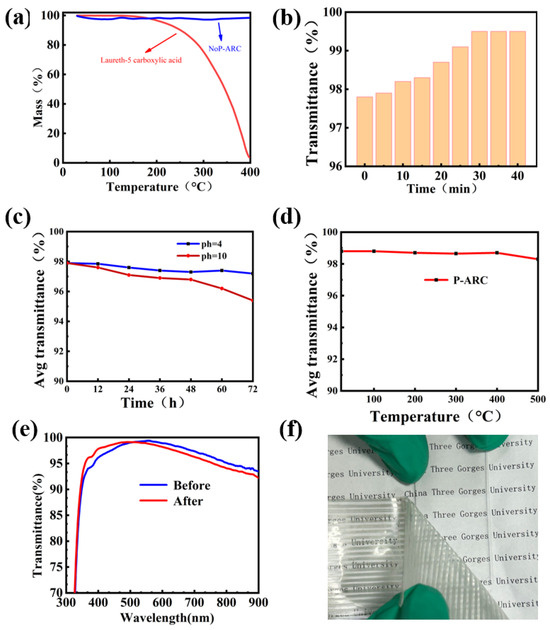 (a) TG curve of the NoP-ARC and LCA; (b) relationship between the transmittance of the P-ARC and the firing time at 220 °C was examined; (c) transmittance of the P-ARC immersed in the solution with different pH values for 12, 24, 36, 48, 60, and 72 h; (d) high temperature on the transmittance of the P-ARC; (e) UV–Vis transmission spectra before and after the 3M tape test; (f) 3M tape test diagram.