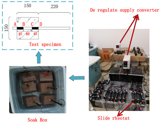 The accelerated wet electrified method is used as the chloride erosion test, as shown in Figure 1. A pad is added to the bottom of the concrete test block so that the bottom of the concrete is exposed to the sodium chloride solution and the bottom of the steel bar is not exposed to the solution. The exposed steel bar is sealed with glass glue, and one end of the wire is welded to the steel bar, and the other end is led out and connected to the DC power supply. To prevent the influence of disorderly current on the test process, all test blocks and sodium chloride solution in this test are placed in a plastic basin, and current loss can be avoided at the same time. By combining a universal meter with a sliding rheostat, the regulated power supply and sliding rheostat are adjusted to the appropriate gear to ensure that the current density is stable at 0.8 ma/cm2. Dry concrete has a large resistance, and the power process is prone to exceeding that range. Therefore, before the test began, the specimen was soaked in a 15% sodium chloride solution for three days to make the solution fully enter the pores of the concrete and reduce the resistance of the concrete. After soaking, the concrete test block is placed in the solution, and the steel bar that needs to accelerate corrosion is connected to the DC power anode through a wire; The stainless steel bar is connected to the DC power supply cathode and placed in the sodium chloride solution. To avoid overrange, first adjust the DC power supply voltage to the maximum range, adjust the current to the minimum range, and then turn on the switch and slowly fine-tune to the design voltage. Owing to the accumulation of rust, the electric resistance of the specimen is in a state of change. Thus, the electric current through the specimen is measured regularly during the test, and the sliding rheostat is adjusted to ensure that the electric current cannot fluctuate over a large range.