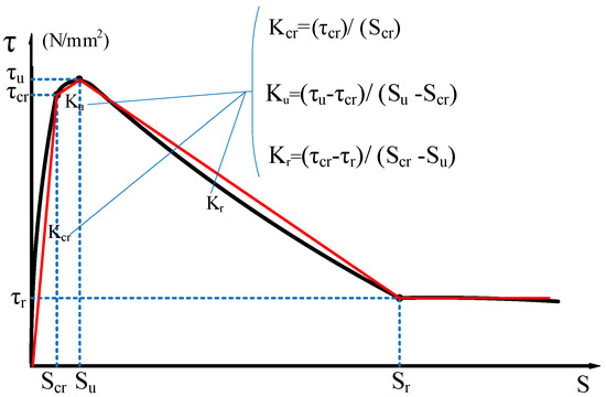 The characteristic points (τs, SS), (τcr, Scr), (τu, Su), and (τr, Sr) are used to divide the τ–s curve into a microslip section, an internal crack slip section, a splitting section, a descending section, and a residual section. The secant modulus between the characteristic points of the τ–s curve is the bond stiffness of each stage (Kcr, Ku, and Kr are the internal crack slip stiffness, splitting slip stiffness, and descending section stiffness, respectively), as shown in Figure 4 [24]. Taking the τ–s curve model proposed by Xu [25] as a reference, the τ–s curve of each group is shown in Figure 5.