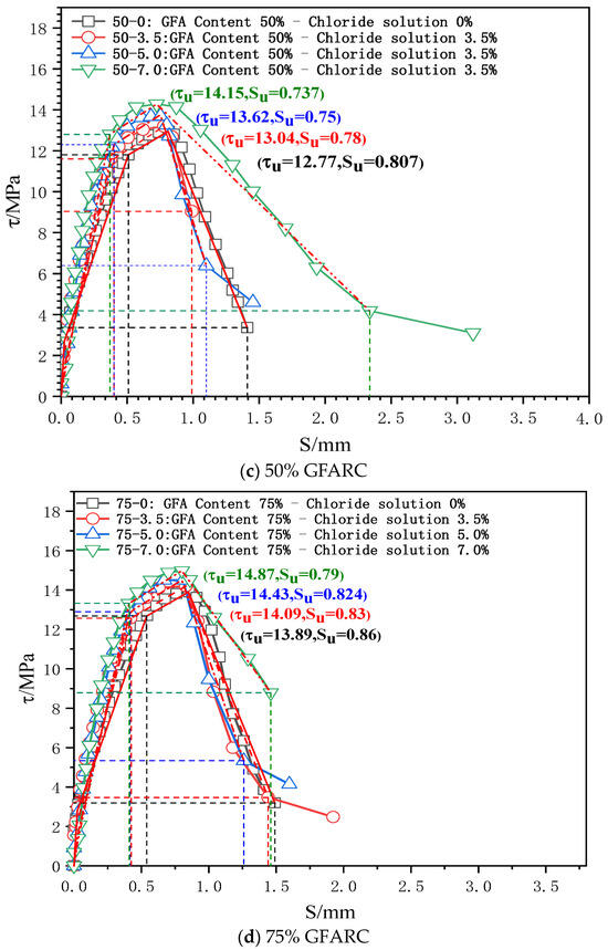 As shown in Figure 10, it can be seen that the peak slip of the GFARC test group is greater than that of the NARC test group under the initial state and chloride corrosion at various concentrations, which is consistent with the comparison results of the ultimate bond strength. Taking the ultimate bond strength of NARC as the benchmark value, 25%GFARC, 50%GFARC, and 75%GFARC increased, respectively, by 5.25%, 5.78%, and 13.27% under the control condition. The GFARC groups increased, respectively, by 6.78%, 8.03%, and 16.48% under 3.5% chlorine erosion. The GFARC groups increased, respectively, by 7.39%, 7.11%, and 17.21% under 5% chlorine erosion. It can be concluded that glass sand has a significant effect on the bond ductility of reinforced concrete. And the influence of glass sand on the bonding property is more and more obvious with the deepening of erosion.