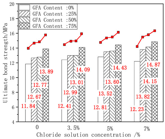 The ultimate bond strength increases with an increase in chloride concentration from 0% to 5%. When the concentration was 7%, the ultimate bond strength of the NARC test group decreased, which was different from that of the GFARC test group. From this phenomenon, it can be inferred that mild (suitable concentration range) chloride erosion is helpful to improve the bonding performance between reinforcement and concrete. But the addition of glass sand can lead to the expansion of the suitable concentration range, in which the chloride ion has a positive effect on bond properties.