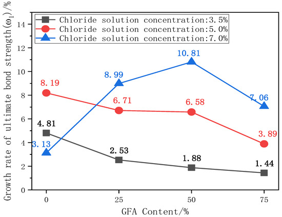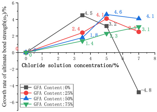 To further analyze the influence of the glass sand on the bond strength under a chloride attack, the curves of the ultimate bond strength growth ω2 with chloride concentration are plotted in Figure 8, where ω2 is the ultimate bond strength growth rate between adjacent chloride concentrations.