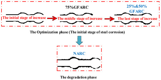 (1) According to the growth characteristics of the bond strength at the initial stage of corrosion, this stage can be divided into three stages: the initial stage of increase (the increase in bond strength is small), the middle stage of increase (the increase is large), and the late stage of increase (the increase is attenuated). Finally, the increase in bond strength stops, and the optimization period of the bond strength caused by steel corrosion ends. As shown in Figure 9.